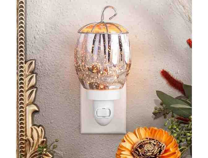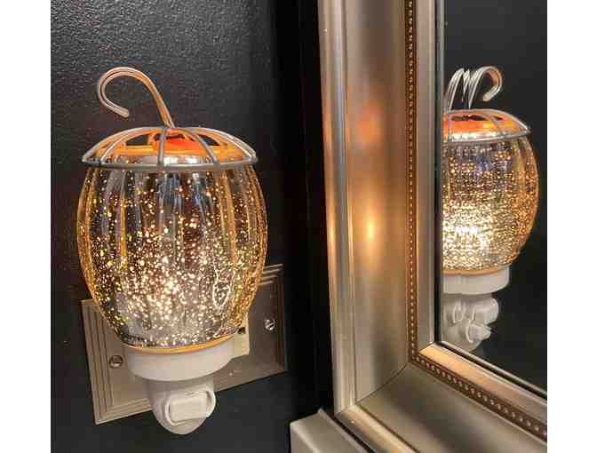 Mirrored mercury glass and a dreamy twinkle sets this mini warmer apart from the rest of the patch. Dimensions: 5.5" tall. Wattage: 10W. Finish: Glows when lit. This beautiful warmer will be accompanied by three surprise variations on Pumpkin Wax Bars! Material: Glass