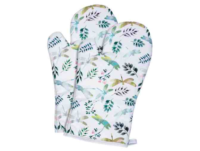 Set of 2 100 % cotton. Loop for hanging 12" L x 7" Dragonflies and greenery, in watercolor style. This oven mitt pair can be thrown into the washer when they need a quick refresh.