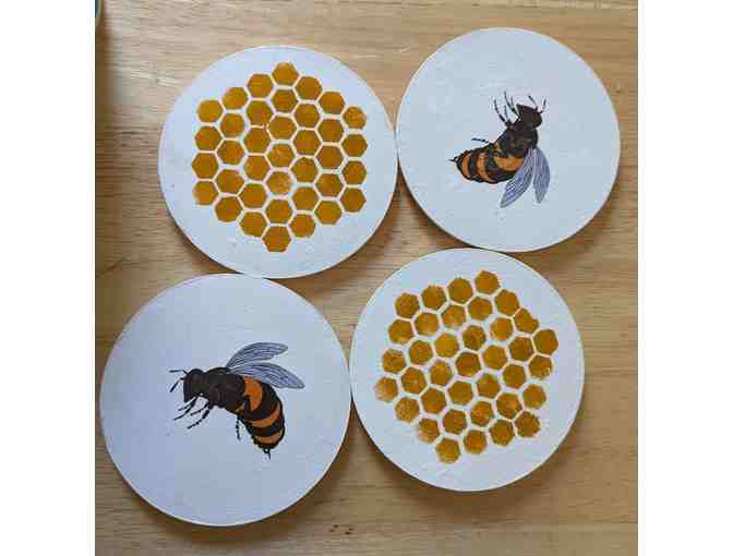 Hand crafted 4 inch round coaster set. Covered with a liquid vinyl to make them water and heat resistant.