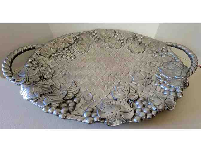 Made from a tarnish free alloy metal that shouldn't break, chip or crack under normal use. It is in Excellent Condition. This platter is perfect for any decor whether it is casual or formal - great for serving food at a table setting or buffet, used on an entry way or coffee table and with its grape & leaves pattern it's ideal for a wine tasting party.