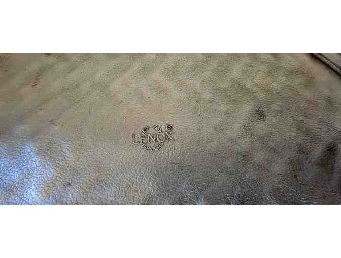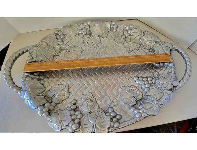 Gorgeous quality made by LENOX - a Large 22 1/2" Long x 15 3/4" Wide Metal Serving Tray or Platter. It has a beautiful design of grapes, vines and leaves encircling the woven weave pattern in the center. Large handles on each end. Marked & signed Lenox on the bottom.
