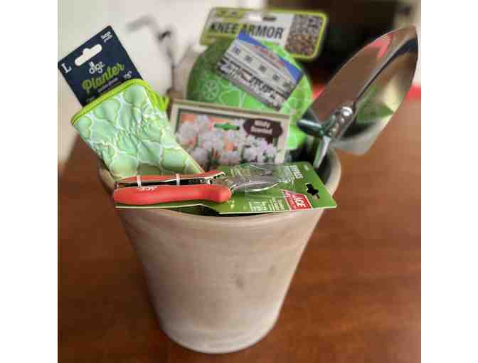 This package, donated by Ace Hardware Goffstown NH, includes knee pads, shovel, gloves, bypass pruner, trowel, bulbs, and a $25.00 gift card all in a nice pot.