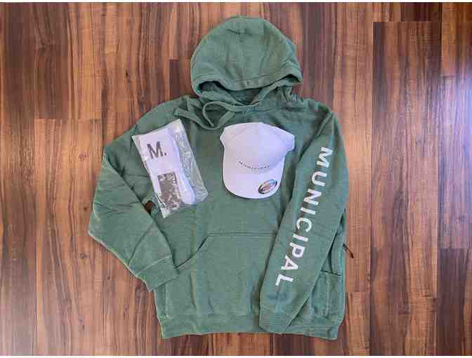 Assorted apparel from Carlsbad based Municipal. Includes one (1) Medium Gameday Hoodie in Heather Green, Men's Large Crew Sock in and White (1) and Standard Issue Flexfit Hat in and White/Black (1) OSFA. Co-founded by Mark Wahlberg, MUNICIPAL was created in 2019 to inspire people to bet on themselves and make big things happen. We're driven by our core values character, hustle, positivity, self-belief, creativity and believe no dream is out of reach if you're willing to put in the work. https://municipal.com/