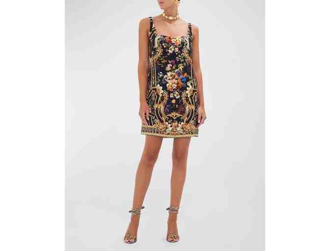 Camilla Square-Neck Sleeveless Floral Shift Dress with gold buckle, adjustable straps. The dress is lined with 100% cupro fabric in the same print as the dress. Sparkles and embellishments are attached by hand to each of Camilla's designs.