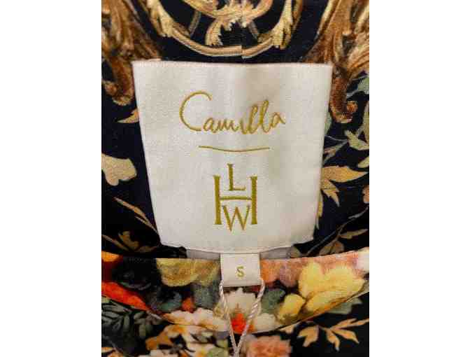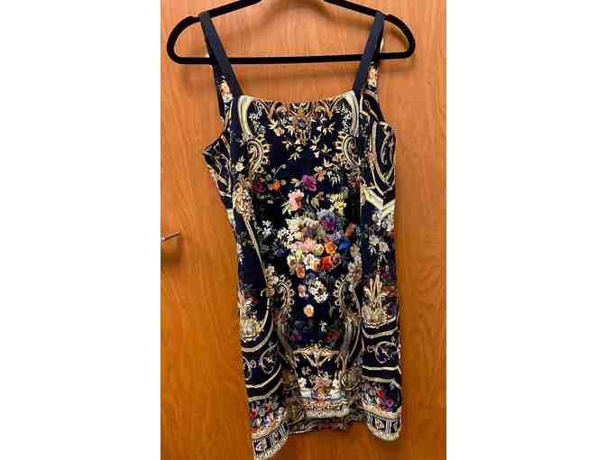 Tag in dress reads: Camilla garments are enriched with handmade embellishments - beads, sequins and crystals. These are applied by hand and differences between garments are unavoidable. Some embellishments may come off the garment.