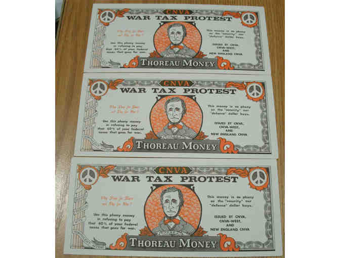 Three "peace yen" of Thoreau Money, issued decades ago by the Committee for Nonviolent Action. "Use this phony money in refusing to pay that 60% of your Federal taxes that goes for war." Each one measures about 7.5 x 3 inches.