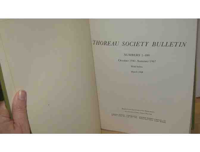 Thoreau Society Bulletin. Number 1-100. October 1941-Summer 1967. With Index. The Thoreau Society / State University College, Geneseo, New York, 1968. First reprinting, 1970. Bound volume. A nice resource to have, especially for the index to the contents of the first 100 issues of the TSB. This volume is in good condition for its age. Carries the Thoreau Foundation / Thoreau Lyceum tag in the front.