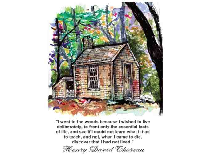A hand-drawn rendering of Thoreau's Walden house, with the quote "I went to the woods because I wished to live deliberately, to front only the essential facts of life, and see if I could not learn what it had to teach, and not when I came to die, discover that I had not lived." A poster created by local artist Marianne Orlando. Measures 16 x 20 inches.