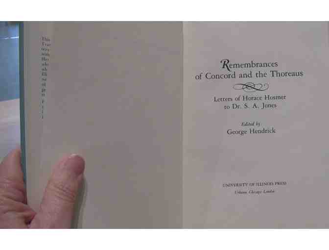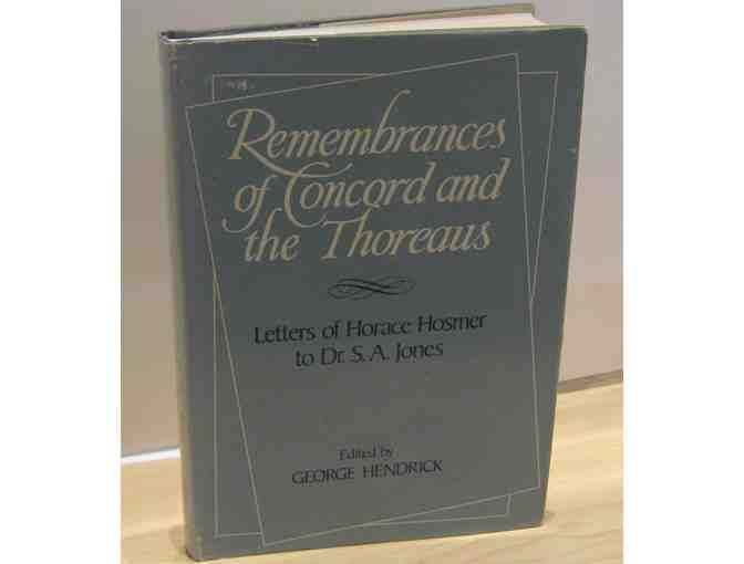 Remembrances of Concord and the Thoreaus: Letters of Horace Hosmer to Dr. S. A. Jones. Edited by George Hendrick. University of Illinois Press, 1977. Hardcover, 157 pp. One of the more fascinating resources for studying the furthering of Thoreau's reputation at the turn of the last century. Horace Hosmer was a resident of Concord. Dr. Samuel A. Jones was a Thoreau fan in Ann Arbor, Michigan. Light aqua cloth with sea foam dust jacket. Dust jacket is faded on and near spine. Pages are nice and clean. Out of print.