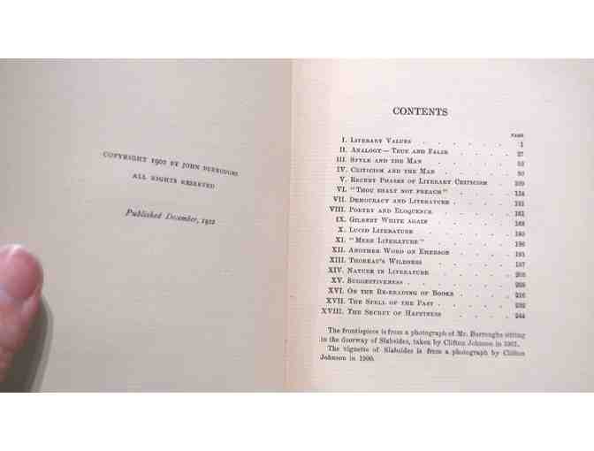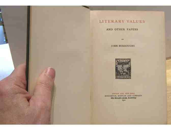 Literary Values and Other Papers, by John Burroughs. Houghton, Mifflin and Company, 1902. 264 pp. Volume XII of the Riverside Edition of The Writings of John Burroughs. Publication was limited to 1000 sets. Green cloth hardcover with gilt decoration, letters, and top page edges. This copy has a faded spine and wear marks on the covers. The pages are aging only at the edges. Nice, overall.