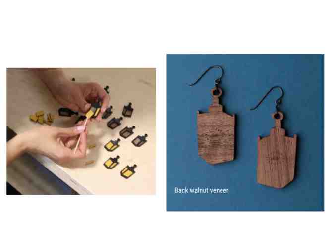 Earrings made from acrylic, wool broadcloth, and walnut veneer. Ear wires are hypoallergenic niobium.
