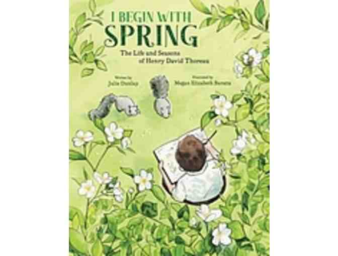 I Begin with Spring: The Life and Seasons of Henry David Thoreau. Written by Julie Dunlap, illustrated by Megan Elizabeth Baratta. Tilbury House Publishers, 2022. A children's biography of Thoreau focusing on his natural history studies. Called in a starred Horn Book review "an excellent introduction to Thoreau and the turbulent times in which he lived." SIGNED BY THE AUTHOR.