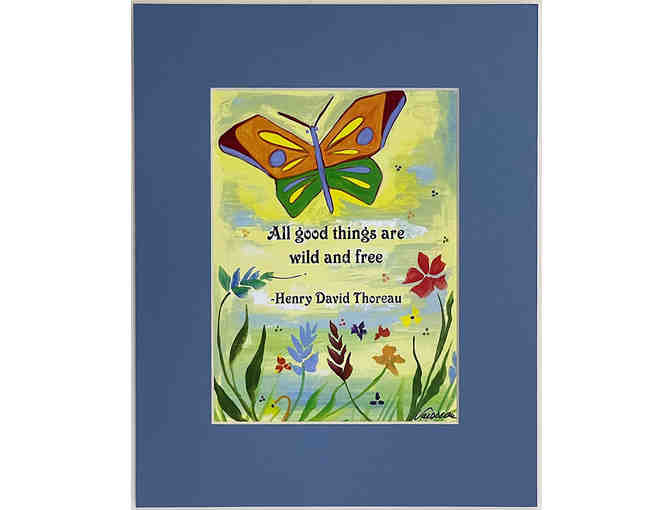 A colorful poster designed by Raphaella Vaisseau of Heartful Art. Features the quote from Henry David Thoreau, "All good things are wild and free. Already enhanced with a light blue mat and ready to frame, the finished piece measures 8 x 10 inches.