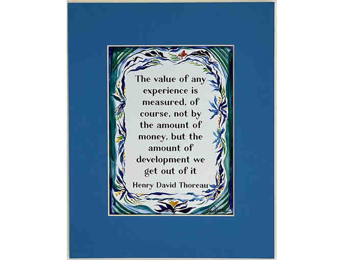 A colorful poster designed by Raphaella Vaisseau of Heartful Art. Features the quote from Henry David Thoreau, "The value of any experience is measured, of course, not by the amount of money, but the amount of development we get out of it." Already enhanced with a sky blue mat and ready to frame, the finished piece measures 8 x 10 inches.