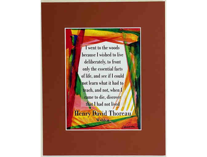 A colorful poster designed by Raphaella Vaisseau of Heartful Art. Features the quote from Henry David Thoreau, "I went to the woods because I wished to live deliberately, to front only the essential facts of life, and see if I could not learn what it had to teach, and not, when I came to die, discover that I had not lived." (The long version of this famous quote.) Already enhanced with a sienna brown mat and ready to frame, the finished piece measures 8 x 10 inches.