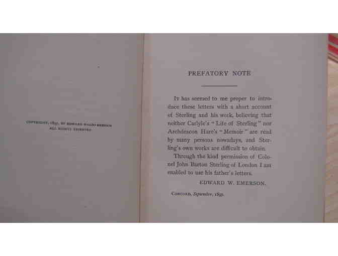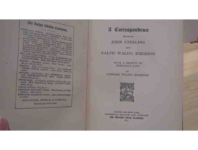 Correspondence Between John Sterling and Ralph Waldo Emerson, With a Sketch of Sterling's Life, by Edward Waldo Emerson. Houghton, Mifflin and Company, 1897. Hardcover, 96 pp. Dusky green gray cloth cover with gilt letters and decoration, gilt top edges. In good condition for its age. John Sterling (1806-1844) was a Scottish author, who was also a friend to Thomas Carlyle, as was Emerson. Includes excerpts from Carlyle correspondence after their mutual friend passed away in 1844.