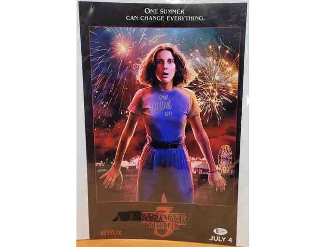 Stranger Things 3 Millie Bobby Brown Autographed Promotional Poster. Comes with a certificate of authenticity.