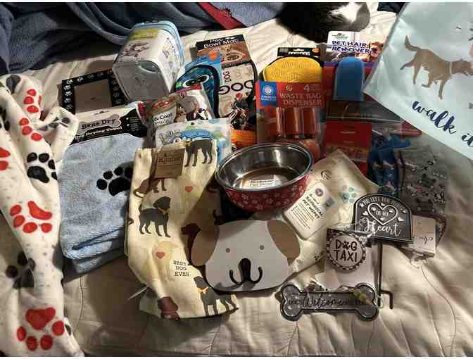 1 reusable shopping bag, 1 stainless steel bowl, 1 paw print picture frame, 1 cut & tied 27x27 fleece blanket with black Sherpa backing, 1 kitchen towel, 1 dog drying towel, 2 packages of dog treats, 2 indestructible dog toys, 1 pet bowl mat, 1 pet storage container, 1 waste bag dispenser with 4 refills, 1 package of botanical pet wipes (120), 1 pet hair remover, 1 $10 Pet Smart gift card, 1 portable pet bow,l 1 pet mitt brush, 2 pair ladies quarter socks (gray & blue), 1 pet garden marker, 1 car coaster, 1 dog head leash holder, 1 dog bone dogs welcome anytime.