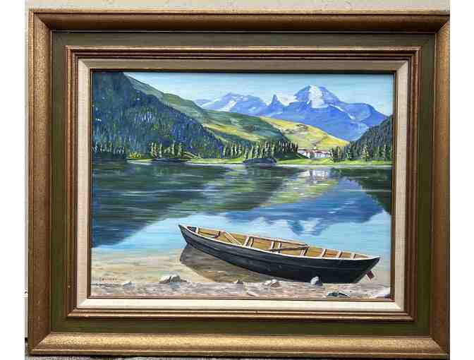 This framed painting was painted by Remo Osenda who emigrated from Ticino, Switzerland. The scene depicts a village in the canton of Ticino in Switzerland with beautiful mountains in the backdrop.