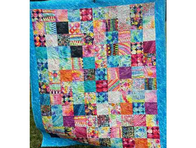 "Bright Rays of Sunshine" is a 62in x 70in lap quilt. It was created by award-winning quilter Veronica "Conaky" Mays of Portsmouth, Rhode Island. It is made of cotton fabric and batting, along with polyester thread.