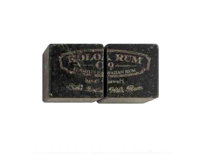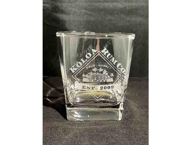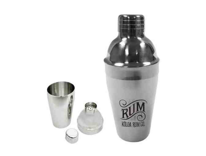 Stainless steel cocktail shaker, 2 Crystal Square-Rocks glasses, stainless steel corkscrew, Koloa Rum Co. logo chill stones