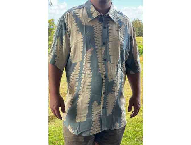 Men's Aloha Shirt Made in Hawai‘i. 100% cotton poplin. Fabric is soft, naturally breathable, and durable. Modern Hawaiian shirt with real coconut buttons. Print-matched left chest pocket. Button down shirt plus button on back of the collar. Limited quantity print. Designed, cut, sewn and Made in Hawai‘i on imported fabric. Ideal for business fashion, weddings and more.