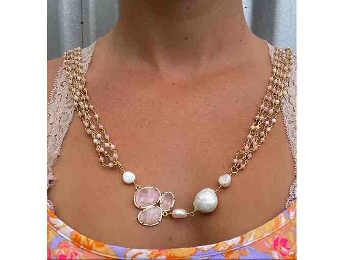 Multiple Crystal chains with a freshwater pearl baroque center, 17 inches long.