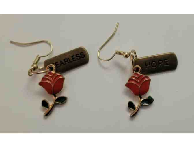 Donated by Michelle Lawrence. A whimsical pair of rose earrings. Uniquely designed with special messages of "fearless" and "hope" attached.