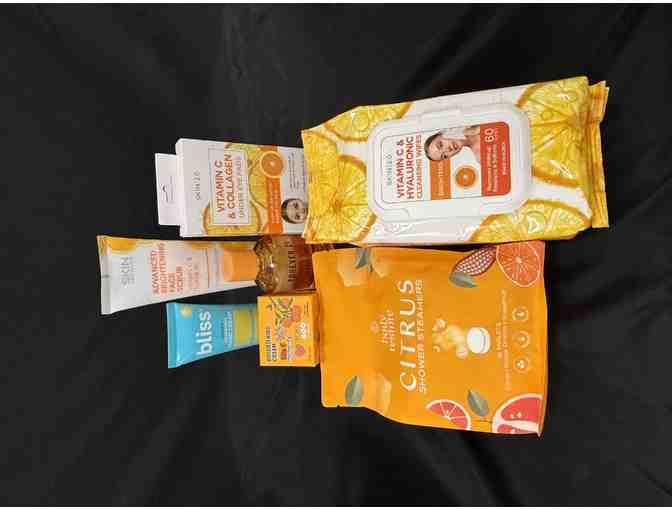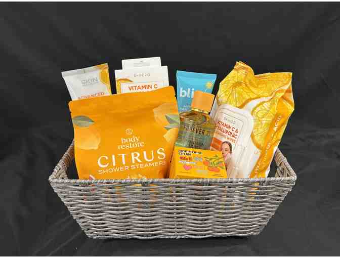 Basket comes with: Body Restore Citrus Shower Steamers, Skin Asthestics Advanced Brightening Face Scrub, Skin 2.0 Vitamin C & Collagen under eye pads and cleansing wipes, bliss cloud 9 nouishing hand cream, forever21 Madarin Muse Eau de Parfum, 3.4 fl. oz.; Dearboo Brightening Vita C Hyaluronic Intensive Cream.