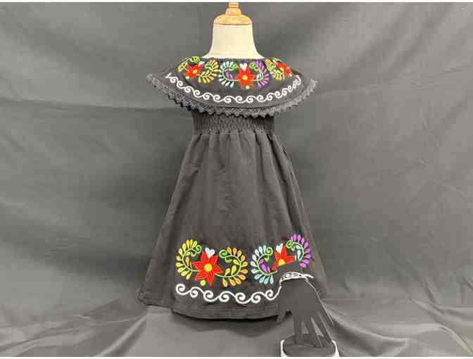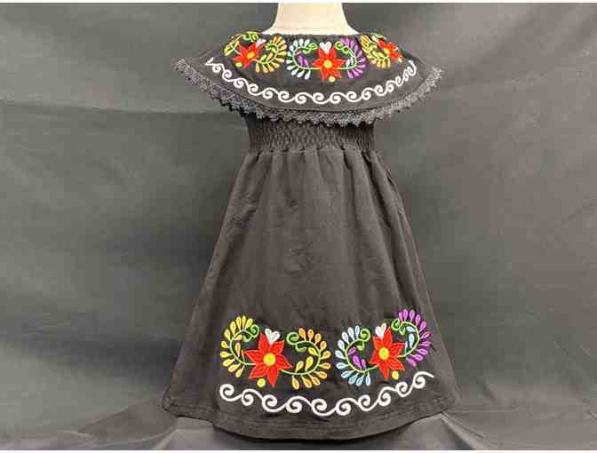 2T-3T Black Toddlers girls traditional mexican floral embroidered drape dress with floral inlay bracelet.