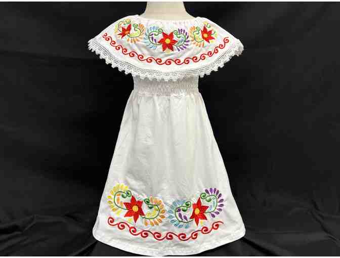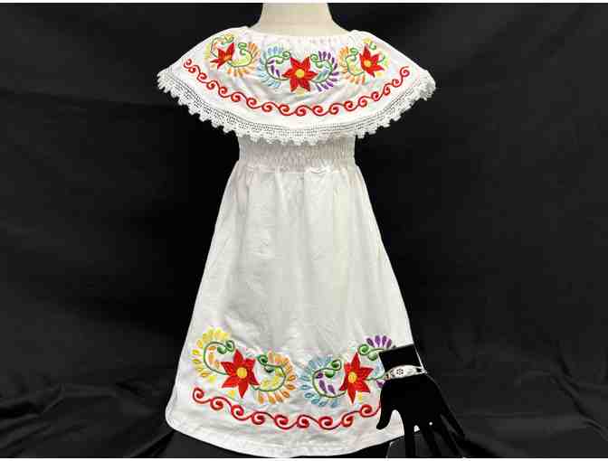 2T-3T White Toddlers girls traditional mexican floral embroidered drape dress with floral inlay bracelet.