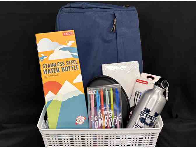 Blue computer carrier bag, stainless steel hydroflask, noise cancelling headphones, multi connection chord to stay charged, white notebook and a set of 6 colored pens