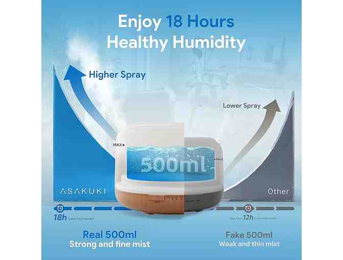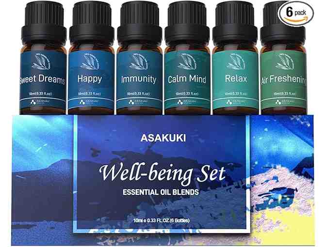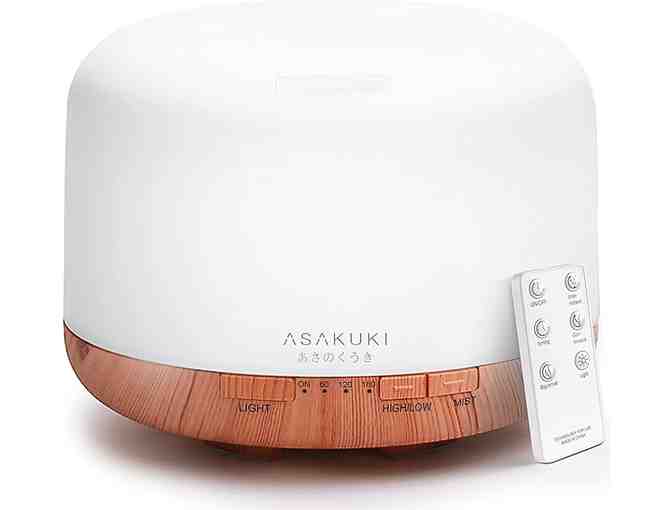 500 ml premium essential oil diffuser with remote control, 5 in 1 ultrasonic aromatherapy fragrant oil humidifier vaporizer, timer and auto-off safety switch. Asakuki Essential oils set, with 6 essential oils, 10 ml: Sweet Dreams, Happy, Immunity, Calm Mind, Relax, Air Freshening.