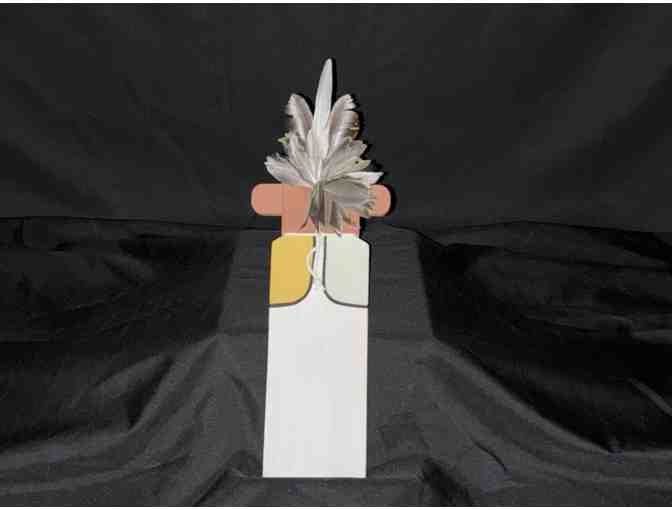 Artist: Ryan Gashweseoma, HOPI "I am a wood worker by trade and use many of the techniques I've learned, to create my pieces. I use many exotic woods such as Paduk, Purple Heart, Ebony, Bubinga to name a few. Each box starts out as a slab of wood in which I measure, cut and assemble myself. The use of a band saw, table saw, router and sanders assist in this process. To piece the boxes together, I use metal hinges and wood glue. Acrylic paints are used for some of the brighter designs you see. The primary material used in my work, is cottonwood root. I utilize woodworker tools such as a rasp, Xacto knives and stainless steel carving knives. All of my carvings are done by hand. For the pigments, I use natural earth pigment paints, some of which Ive gathered myself out on Hopi. The feather work on my dolls exhibits duck, pheasant, grouse and parrot feathers. In certain dolls, you will see the use of yucca, raw cotton, moss, seashells and abalone as accents. The type of carving I do is considered old style katsina carving. This style describes katsina dolls that use more natural earth pigments while also keeping the pose stationary. This is the style I learned from my uncles and grandfather, while growing up in Hotevilla on Third Mesa. The Hopi believe that kachinas are the spirits of all things in the universe, including rocks, stars, animals, plants, and ancestors who have lived good lives. They also believe that kachinas visit villages to help with everyday activities and act as a link between gods and mortals."