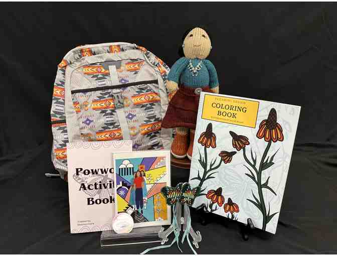Native print backpack with: Navajo doll, Native American coloring book, pow-wow activity book, Native designed card inside, and beaded butterfly hair ties.