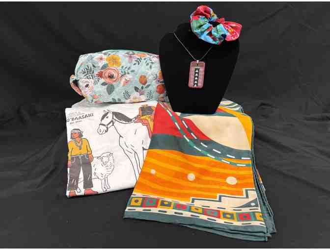 "Get Ready With Me" Kit includes: a floral make-up bag, floral hair scrunchie, Ajoobaasani T-shirt, Jessica Wiarda Honovi scarf and beaded tag necklace.