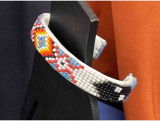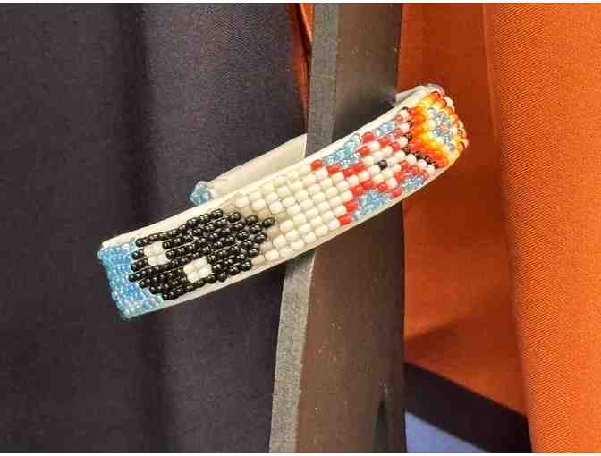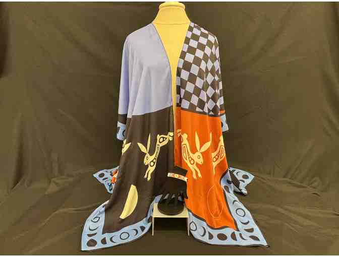 Jessica Wiarda (Hopi) draped kimono, paired with a beaded cuff bracelet. About the Artist: I am an illustrator of Hopi and white descent. I explore my experiences living in two worlds as a biracial American. I have never quite belonged entirely to either world but I think that gives me a unique perspective on life and I enjoy learning new things about both sides of my heritage. I love exploring color and shape in my work and simplifying things like food and people to their most basic forms but still keeping them identifiable. I also like turning those things into fun patterns for various surfaces like stationary, apparel, and packaging. Some things we think are "Native American" don't have anything to do with any tribe at all so I invite you to explore my Hopi artwork and learn about a tribe that doesn't see a lot of representation in mainstream culture.