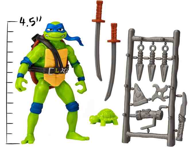 He comes ready for battle with his iconic twin katana, a separate weapons rack with different accessories, and a baby turtle!