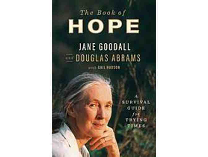The Book of Hope: A Survival Guide for Trying Times, by Jane Goodall and Douglas Adams. Celadon Books, 2021. Decorated hardcover with color illustrated dust jacket. The authors focus on "Four Reasons for Hope" today: The amazing human intellect ; the resilience of nature ; the power of young people; and the indomitable human spirit. Includes many moving and inspirational stories and photographs from Jane's remarkable career. SIGNED ON THE HALF TITLE PAGE BY JANE GOODALL.