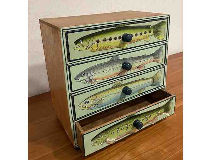 The perfect decorative wooden cabinet. Four drawers for jewelry, desktop essentials, fishing lures, sewing supplies ... you name it. Hand painted in trout chic seafoam pastels.