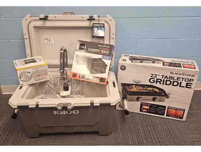 Donated by the Baseball Team, this basket containsTable Top Blackstone Griddle, Carrying Case for Blackstone Griddle, Grill Tool Set, 70 Qt/105 Can Igloo Cooler, 12 Pack Beer, $50 Plath's Gift Card