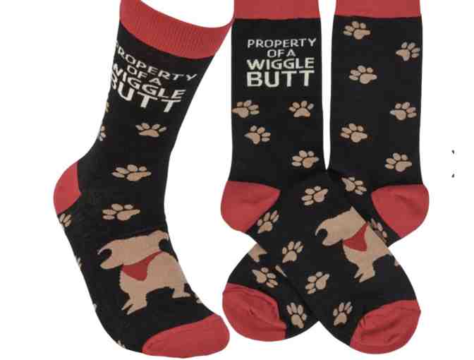 A pair of colorful woven socks from our Pet Collection displaying a dog and paw print pattern with a fun pet-themed sentiment that reads "Property Of A Wigglebutt." Socks feature a one size fits most design made with cotton, nylon, and spandex.