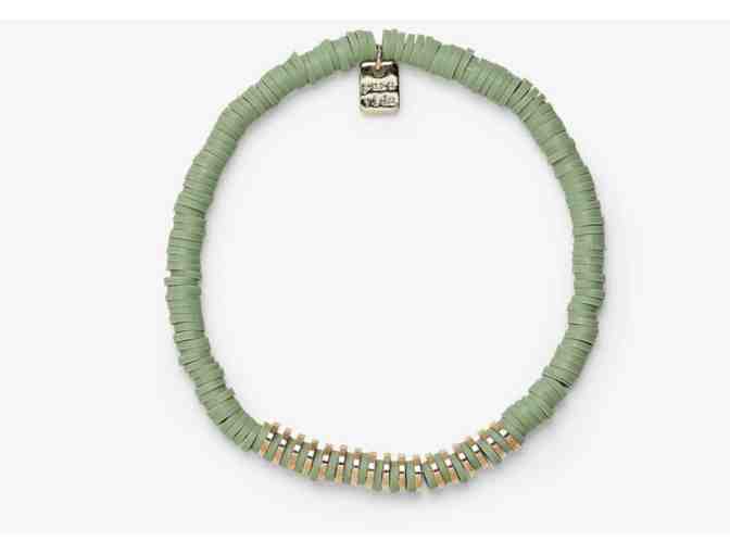 A bracelet that encompasses brilliant balance with multi-faceted style applications. The durable center cord connects a clever pattern of beachy heishi beads.