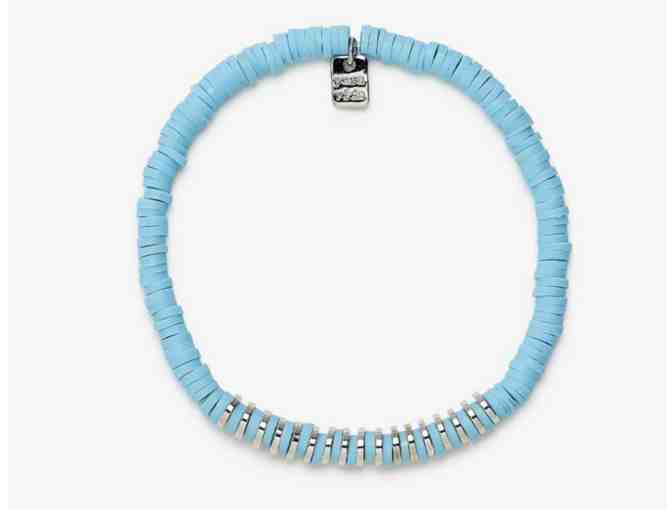 A bracelet that encompasses brilliant balance with multi-faceted style applications. The durable center cord connects a clever pattern of beachy heishi beads.