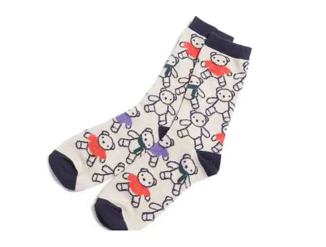 Adorable Toasty Teddie Bear socks with colorful fuzzy accents. 55 percent cotton, 31 percent polyester, 13 percent nylon and 1 percent spandex. Fits womens shoe sizes 5-10.