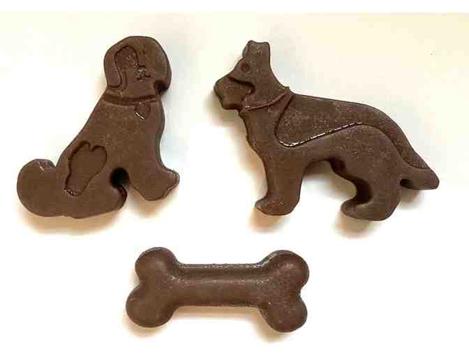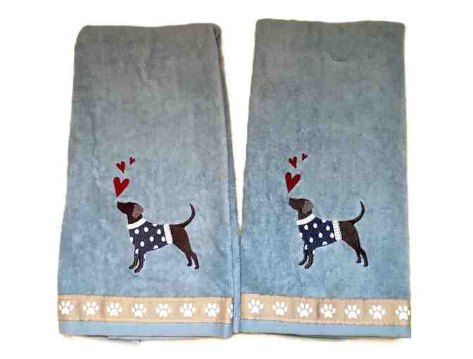 Very nice set of decorative embroidered plush velour hand towels with paw print ribbon trim. Grayish/blue in color. Includes three small fragrant handcrafted dog themed soaps