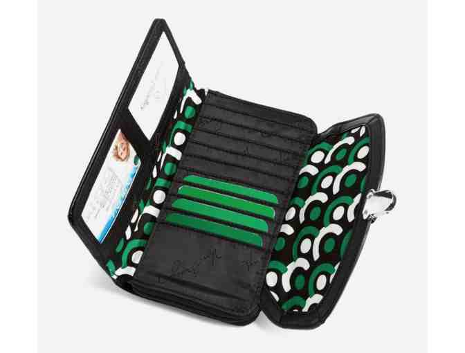 Front pushlock-closure compartment has 10 card slip pockets, two ID windows and a bill pocket
