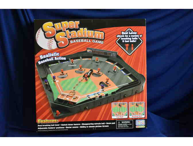 PRODUCT SPECIFICATIONS: Package contains (1) Game Zone Super Stadium Baseball Game with Realistic Baseball Action. Includes (1) playing field, (1) bat, (1) pitcher, (3) base runners, (7) fielders, (3) score pins, (5) balls, score sheet, and instruction manual. 1 - 2 players, Ages 6 and up.