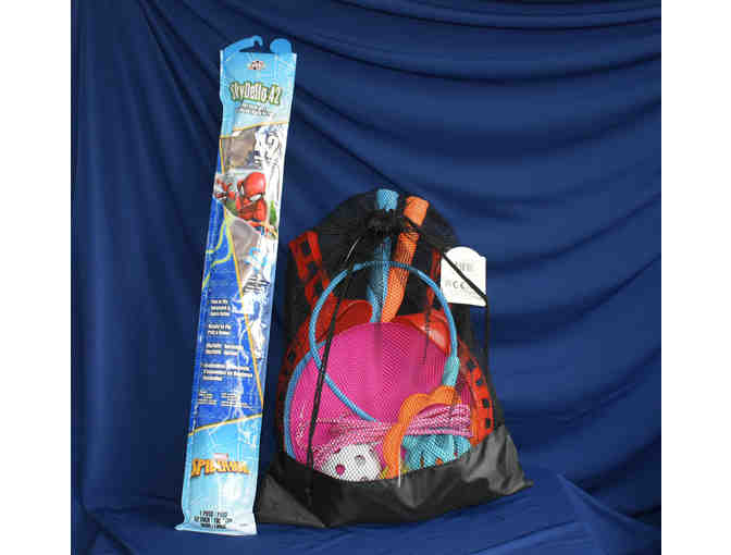 Bag includes: Frisbee, skip-ball (goes around ankle), Jump rope, Scoop and Throw with Wiffle Ball, Two plastic badmimten rackets with birdie.