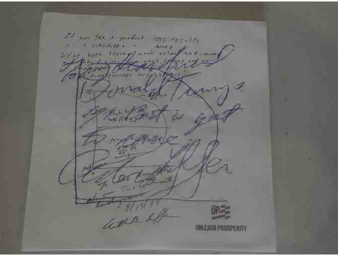 At a recent event sponsored by our friends at Unleashing Prosperity, Art Laffer himself signed a napkin with an illustration of the Laffer Curve, with a note to President Trump and donated it to our auction!